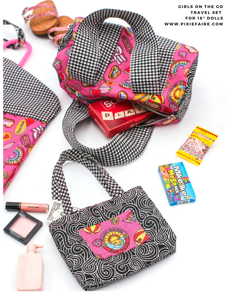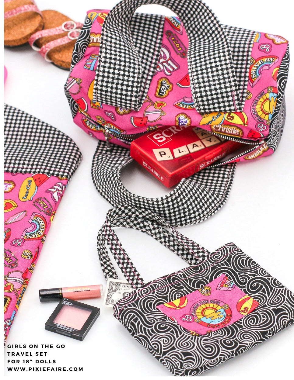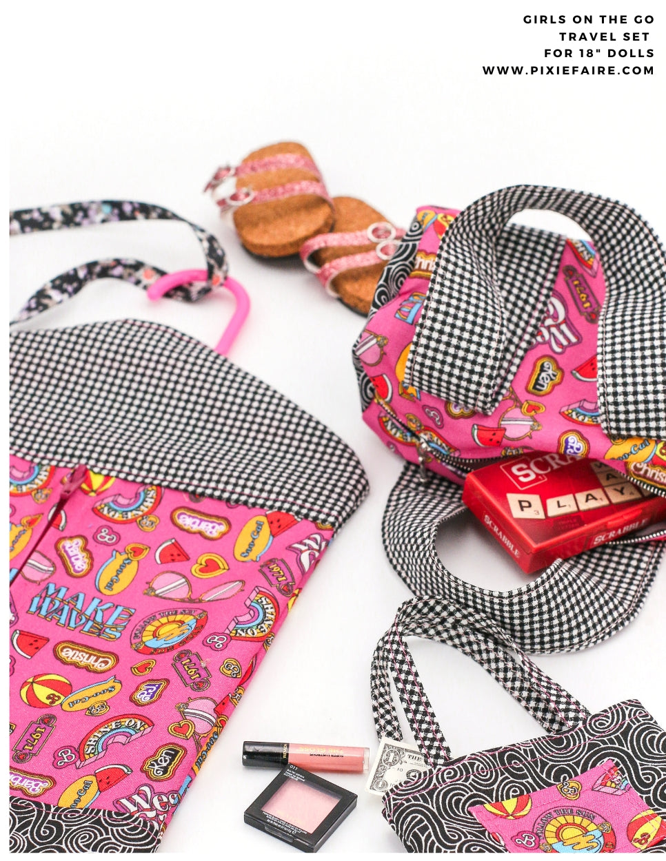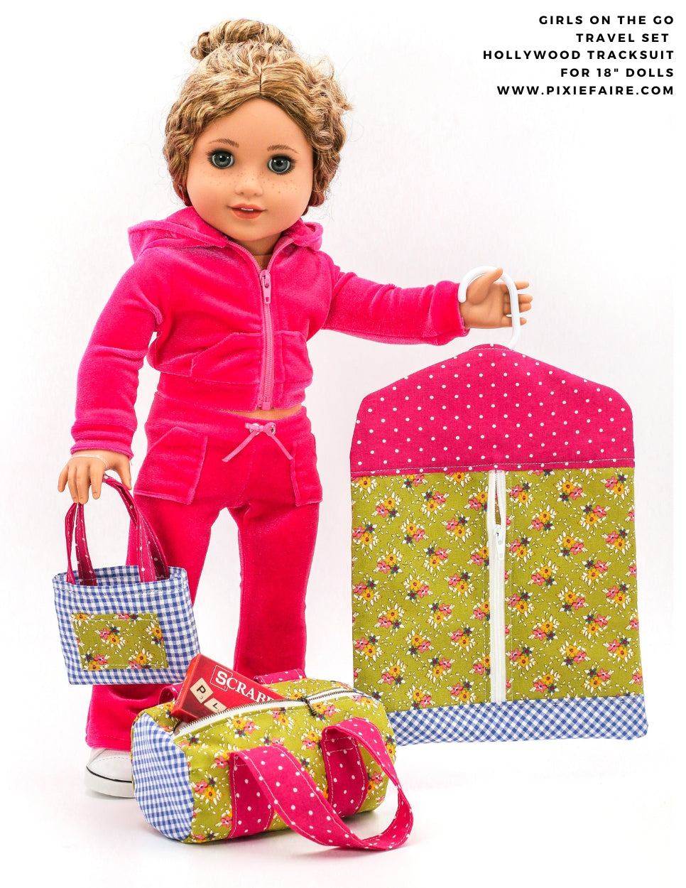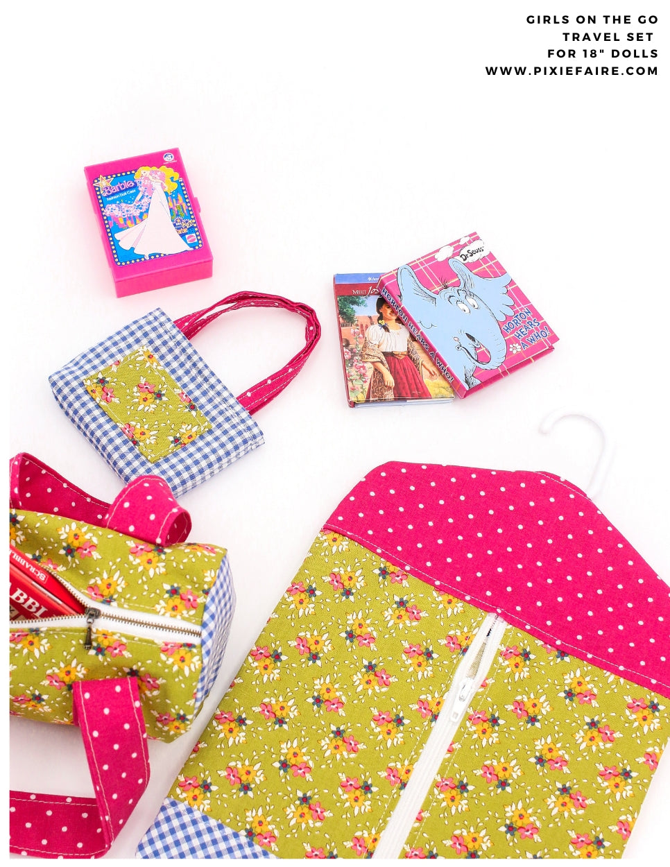 Now your doll can travel in style with their very own travel set with the Girls On The Go 18-inch doll sewing pattern. This bundled set from 123 Mulberry Street includes three great designs - a garment bag, duffle bag, and a cute tote bag!