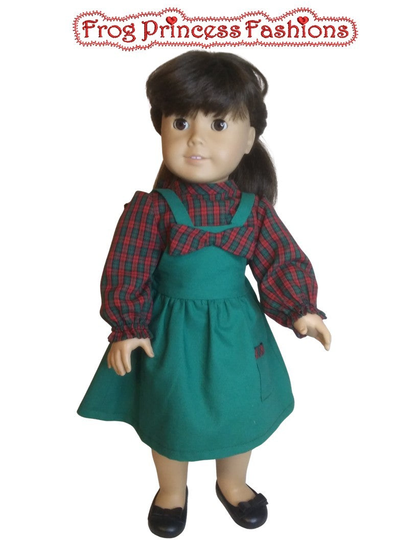 The Frog Princess Fashions Bells and Bows Jumper and Blouse Set©2025 is a versatile addition to any 18” doll’s wardrobe, and includes a festive jumper and ruffled blouse. The set was designed with the Christmas holidays in mind, but can also be a casual set, perfect for any occasion. Stitch up the jumper from almost any woven fabric, from homespun to denim to velveteen. Make the blouse out of a shimmery satin for dressy occasions or a chambray for casual affairs…either way, this set is adorable on your 18” doll.