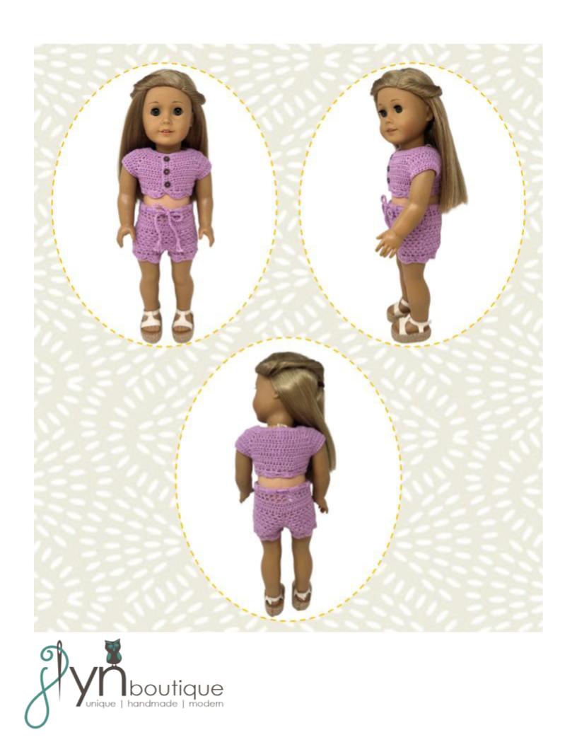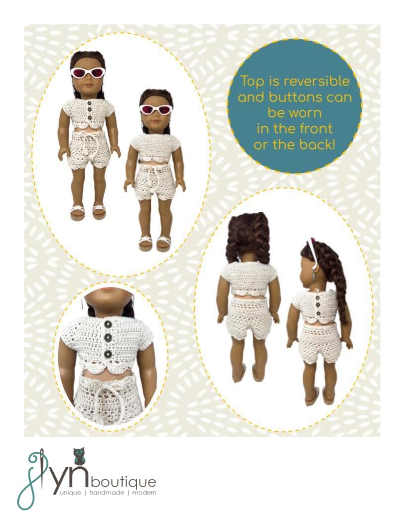 This PDF crochet pattern from J Lyn Boutique is designed to fit popular 18" dolls such as those shown in the photos. Pattern includes clear, step by step written directions and photos for each step.