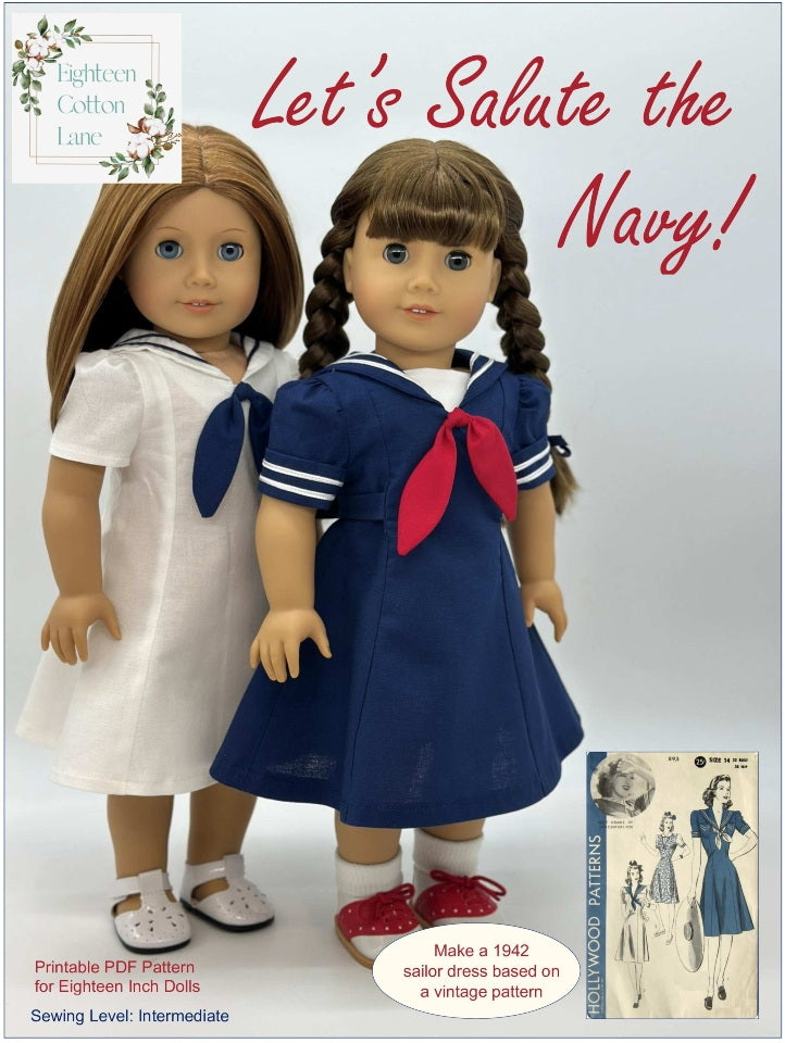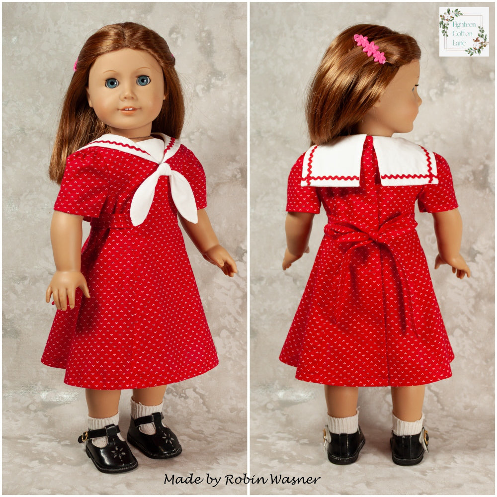 This PDF sewing pattern, by Eighteen Cotton Lane, is designed to fit popular 18" dolls such as those shown in the photos.