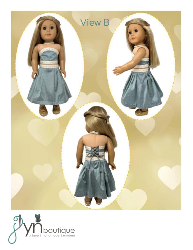 This PDF sewing pattern from J Lyn Boutique is designed to fit 18" dolls such as American Girl®. Pattern includes clear, step by step written directions and photos for each step.