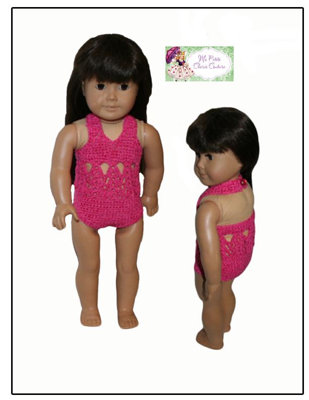 The Sandy Shells Crocheted Swimsuit, by Ma Petite Cherie Couture, is perfect for summer visits to the beach or pool. It features a shell pattern around the midriff with a solid bottom. It has straps that button at the back of the neck and easily slips on with no snaps needed.