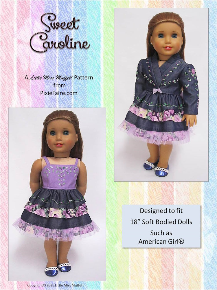 This Intermediate level PDF sewing pattern from Little Miss Muffett is designed to fit popular 18” soft-bodied dolls such as those shown in the photos and is available exclusively from Pixie Faire.
