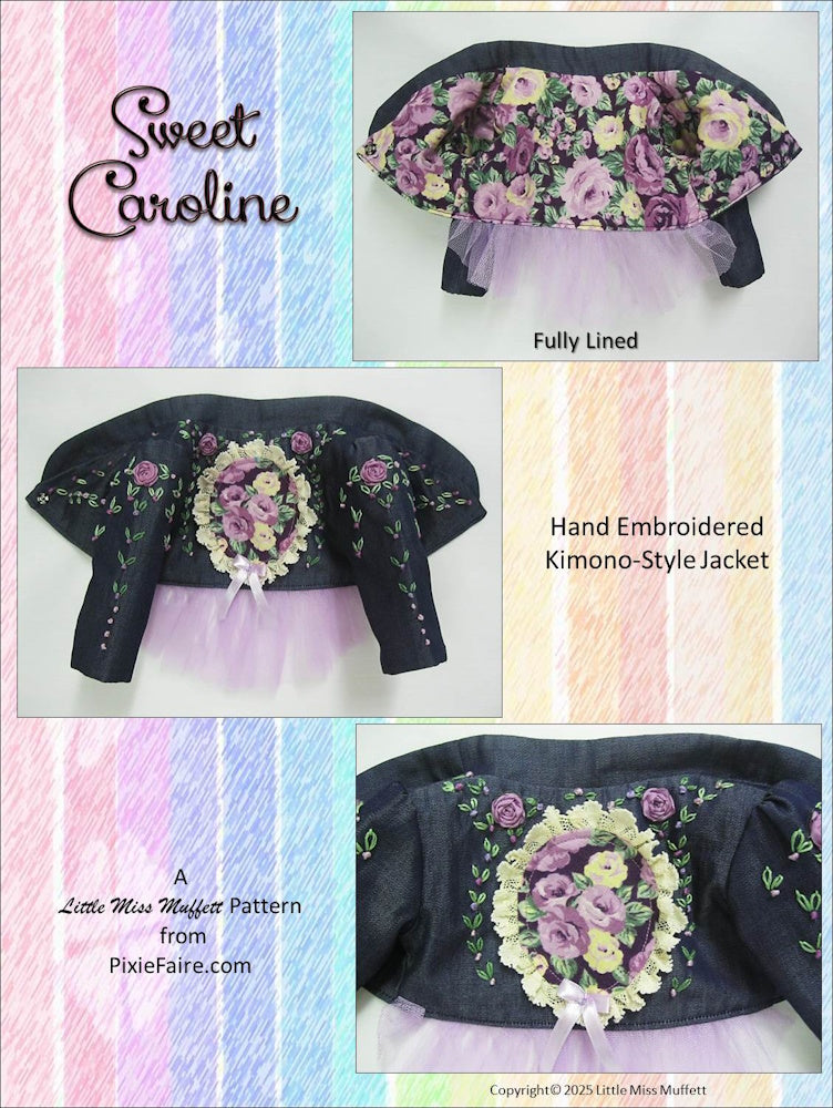 ‘Sweet Caroline’ includes embroidery diagrams for the Dress Bodice, the Skirt and the Jacket Fronts, Back and Sleeves. Stitches, using stranded embroidery thread include French Knots, Chain Stitch, Spider Roses (or Woven Wheel) and Stem Stitch.