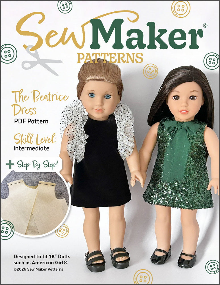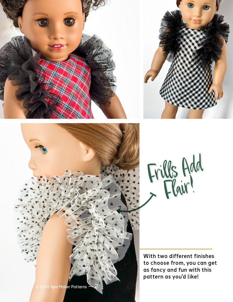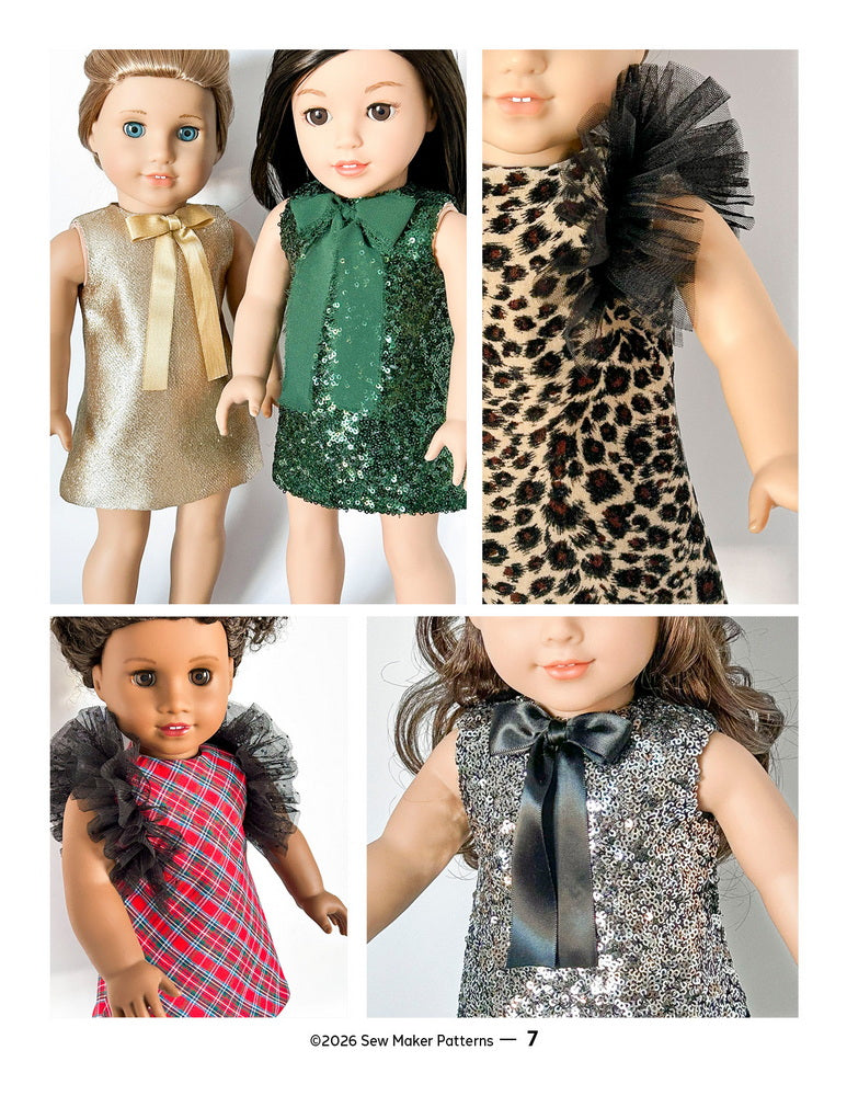 This PDF sewing pattern from Sew Maker Patterns is designed to fit popular 18-inch dolls such as those shown in the photos.