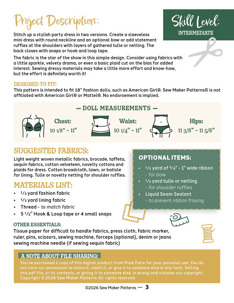 Pixie Faire and the designers featured are not affiliated with doll brands pictured. No endorsement is implied. Dolls are used to show the fit of the designed garments. The product and photography shown in this listing are original content, copyright of the pattern designer.