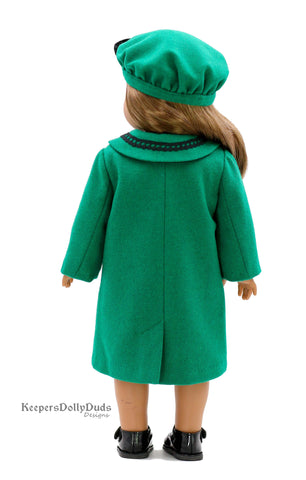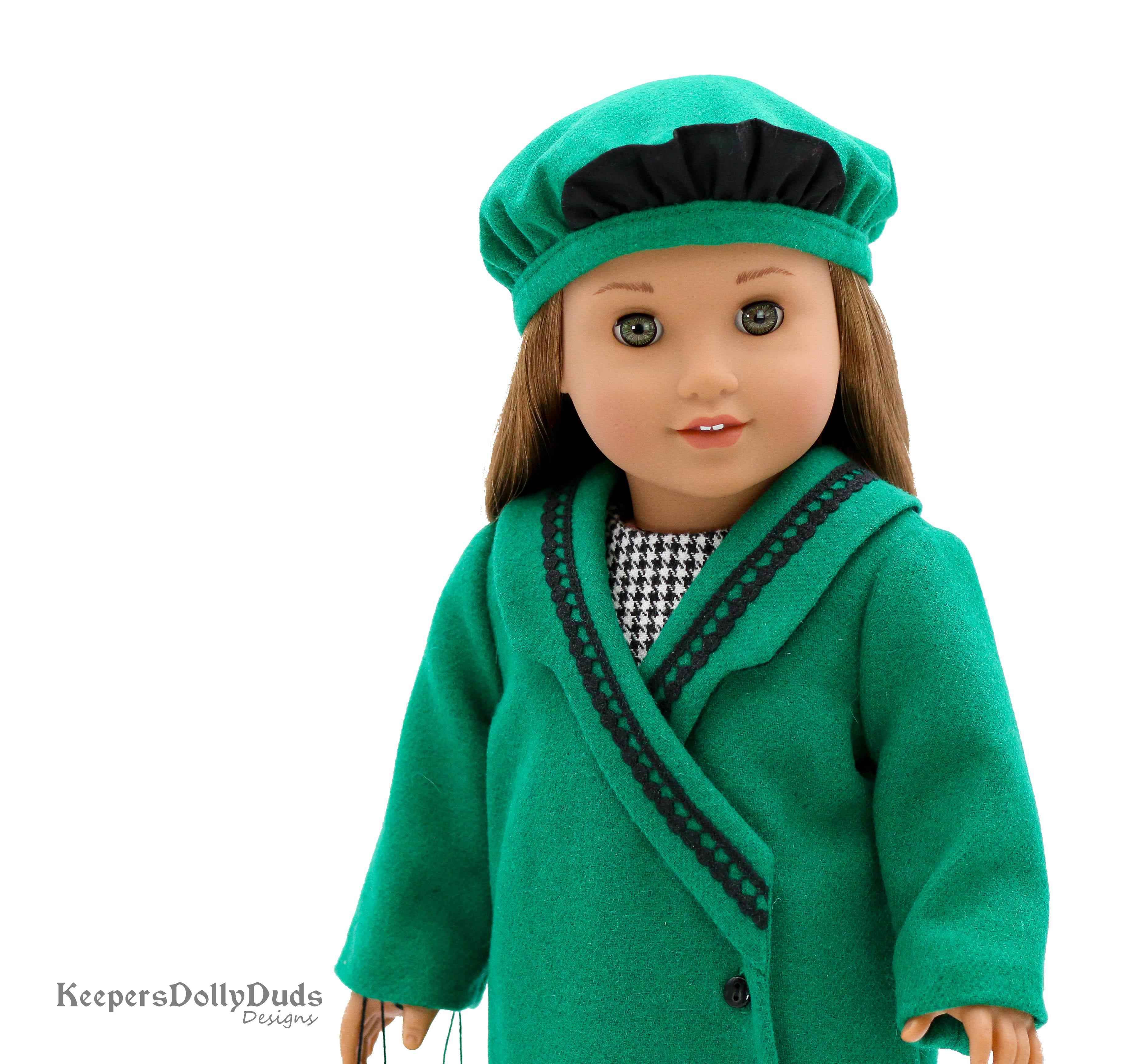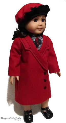 Make a classic 1927 inspired Coat and Tam with this beautifully designed pattern by Keepers Dolly Duds. This fully lined mid-length coat features an art deco style notched collar and off center opening that fastens with three buttons below the hip line. A neat little kick pleat in the back gives this simply styled coat a nice tailored finish. A smart looking tam with a ruffled accent tops off this 1920s ensemble.