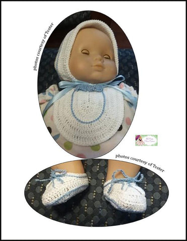 Crochet a darling Bib, Bonnet, and Bootie set for your 15" baby doll. The bib boasts a cute little bowtie. The booties look like little tennis shoes. The bonnet has a folded back brim trimmed in a contrasting color.