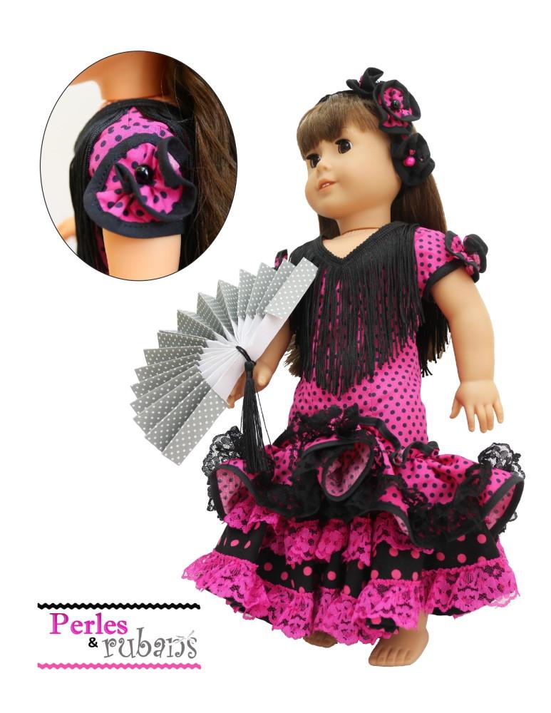 La robe des danseuses de flamenco a connu plusieurs variations, passant tour à tour de la sobriété à l’exubérance. En voici une version, justement pleine d’exubérance et de détails. Les deux volants garnis de dentelles donnent un mouvement ample au bas de la robe et les franges du col en V s’envoleront à chaque mouvement de danse, accompagnant le rythme de la musique. Les manches sont décorées de rose et de perles, éléments que nous retrouvons également dans un bandeau qui entoure les cheveux et permet à la danseuse de jouer également avec le mouvement de ses cheveux tout en libérant le visage. Un éventail, outil indispensable à la danse flamenco, vient compléter la tenue. La robe se ferme à l’arrière grâce à une fermeture à glissière invisible, qui permet de conserver toute la grâce de la robe.