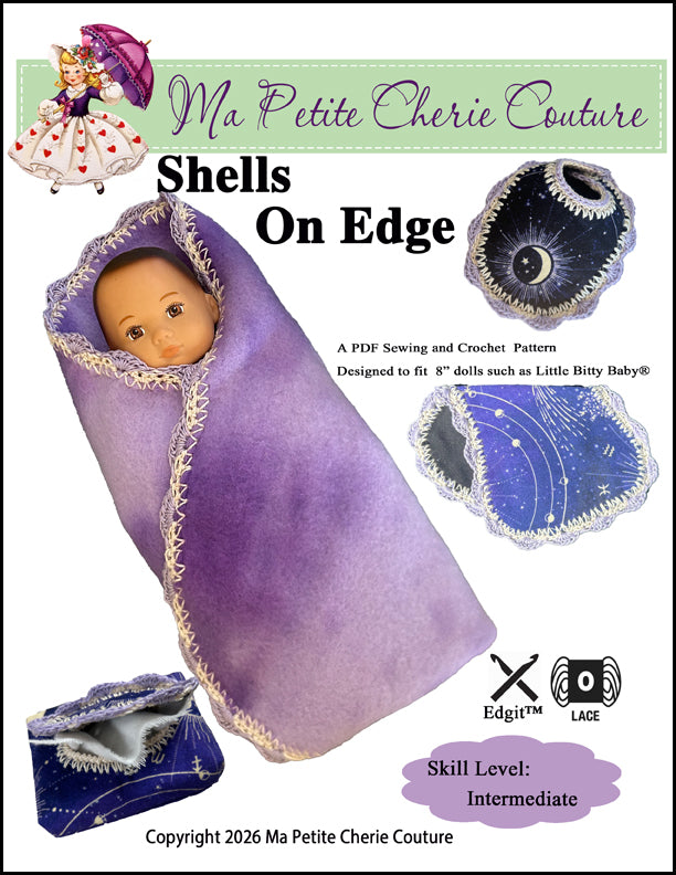 Shells on Edge is a dolly care set that includes a receiving blanket, bib, burp cloth and wipes case full of wipes. It works up quickly using the Edgit tool set. This pattern combines both sewing and crocheting.