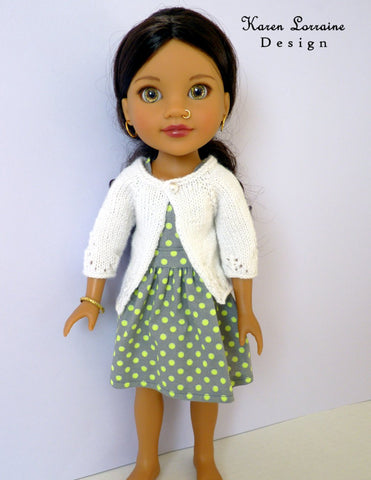 This cardigan will fit 14-14.5 inch dolls like Wellie Wishers™ and Hearts for Hearts® dolls. It can also be used for most yarns (and is pictured on the front cover in 100% merino wool).