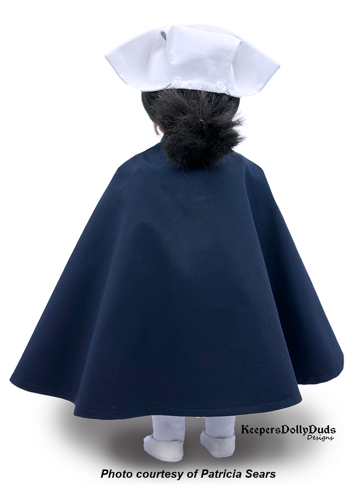 This 1940s era Nurse’s cape by Keepers Dolly Duds is a truly timeless garment. Made from only two pattern pieces, it is a snap to make. The fully lined cloak is cut from a full circle of cloth and tailored at the shoulders to give it a nice even drape. It fastens at the front neckline with a single button or snap. Although it is made specifically to go with the 1940s Nursing Student uniform, it is a stunning outer garment that can be worn with outfits from any time period!