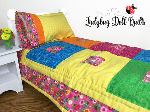 With this PDF pattern you'll be able to make a quilt, pillow, and pillowcase perfectly sized to fit the beds of 18" dolls such as American Girl®.