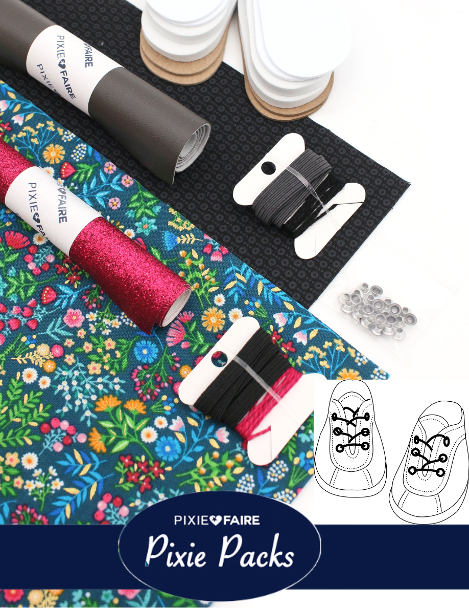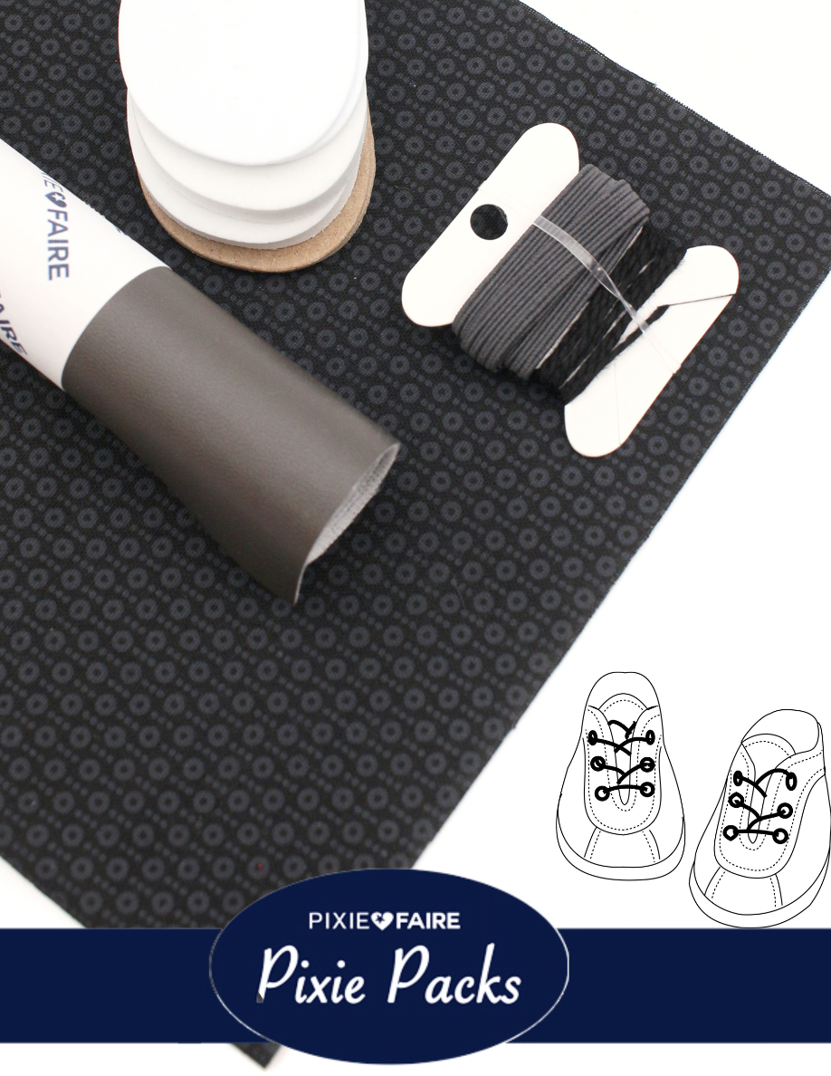 The Boho & Black Retro Sneakers Pixie Pack: This Pixie Pack provides everything you need to make 2 pairs of QTπ Pattern Co. Retro Sneakers shoes for 18 inch dolls!