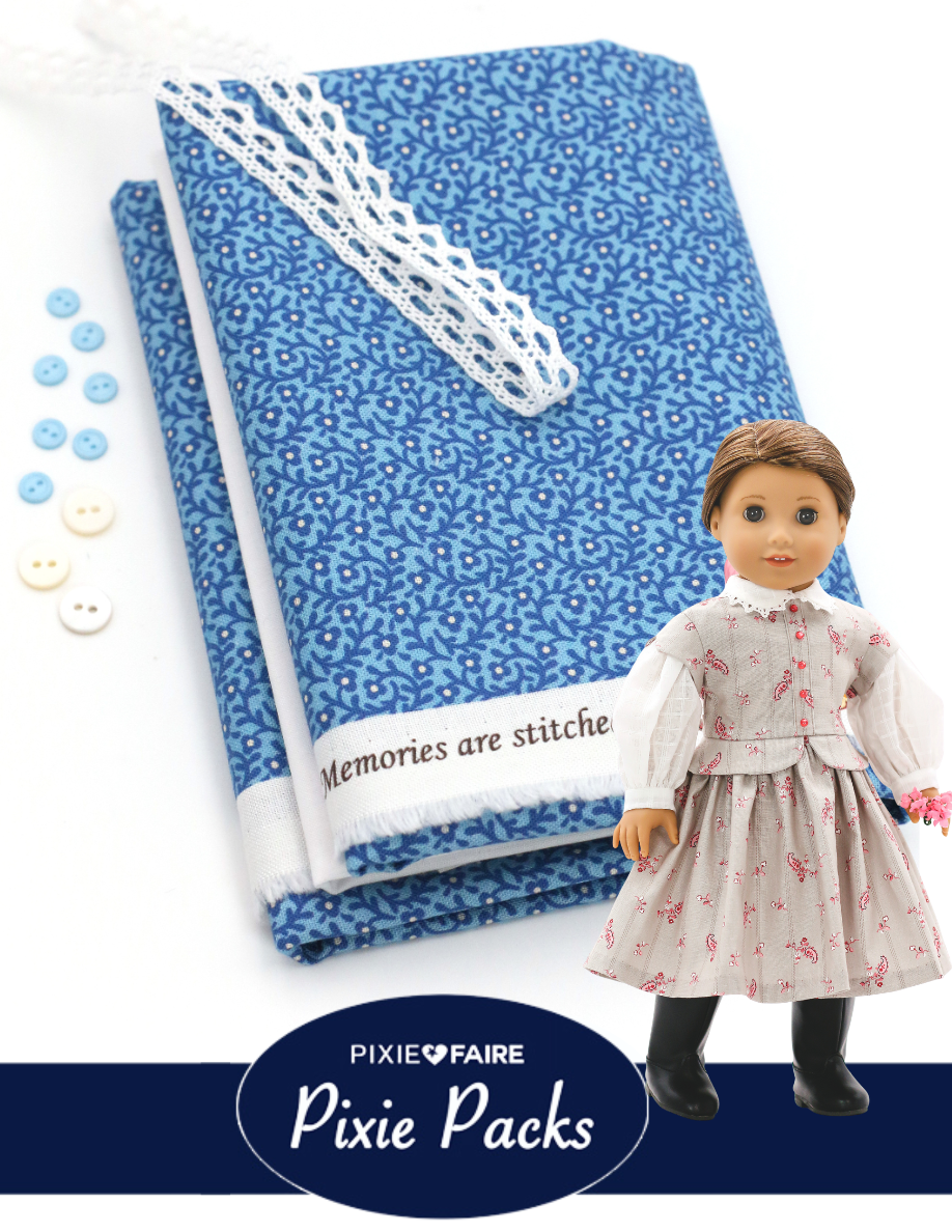 The Civil War Dress Pixie Pack: This Pixie Pack provides everything you need to make the Keepers Dolly Duds Civil War Dress* for 18 inch dolls in a beautiful reproduction print from Betty Chutchain's Sallys Stitches collection for Moda Fabrics.