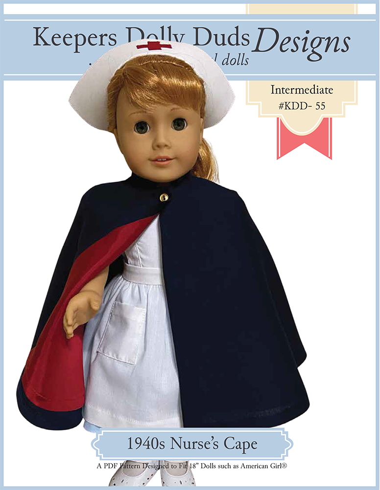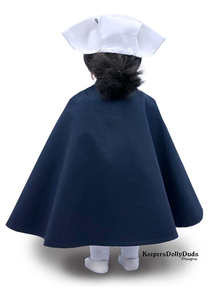This 1940s era Nurse’s cape by Keepers Dolly Duds is a truly timeless garment. Made from only two pattern pieces, it is a snap to make. The fully lined cloak is cut from a full circle of cloth and tailored at the shoulders to give it a nice even drape. It fastens at the front neckline with a single button or snap. Although it is made specifically to go with the 1940s Nursing Student uniform, it is a stunning outer garment that can be worn with outfits from any time period!