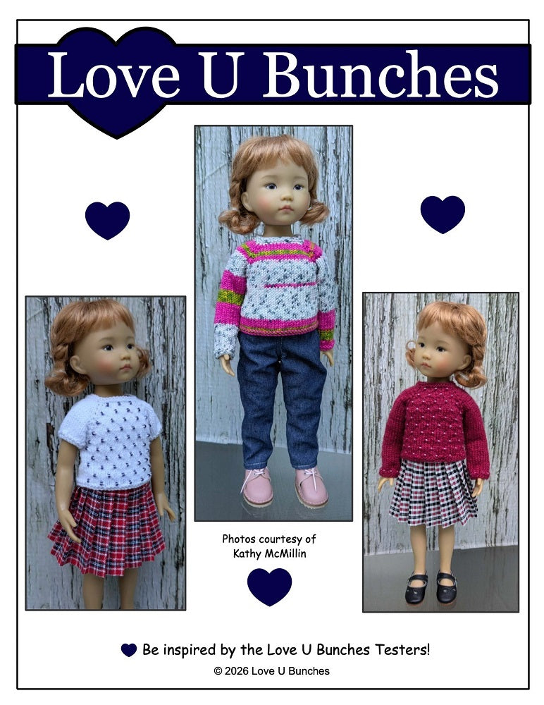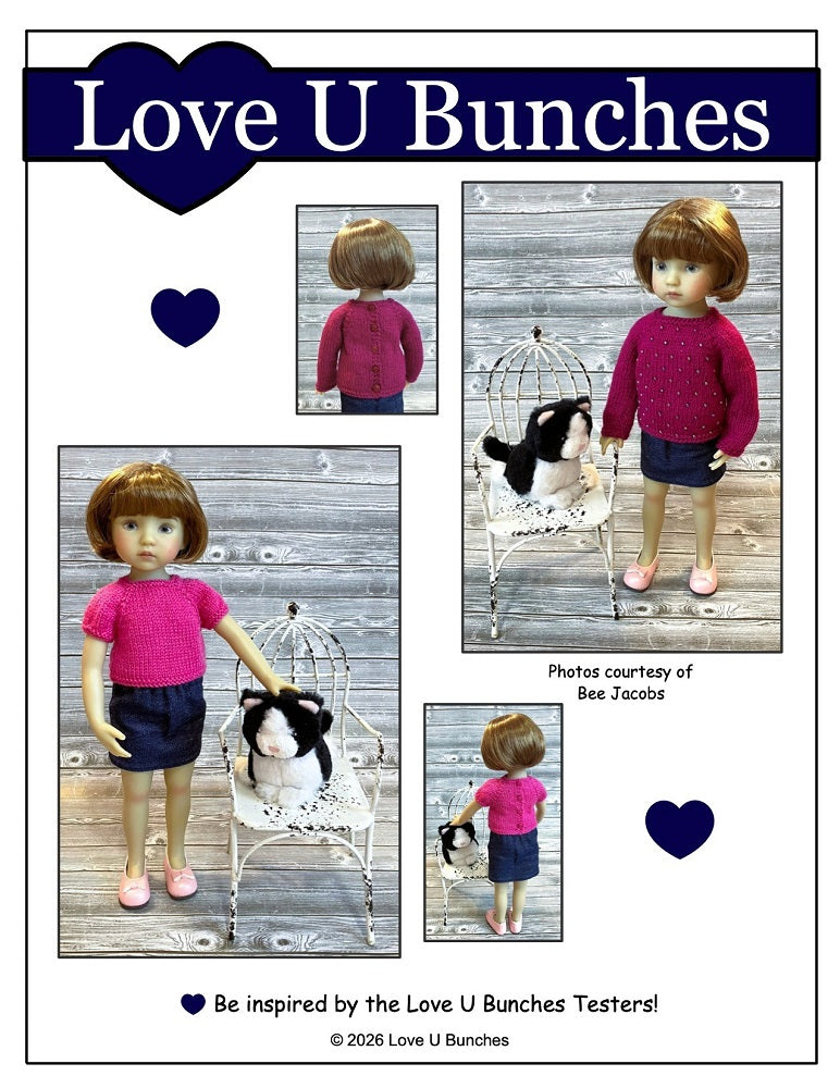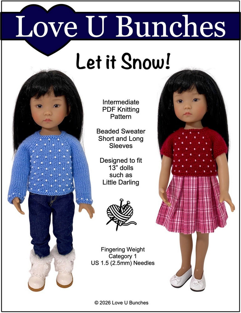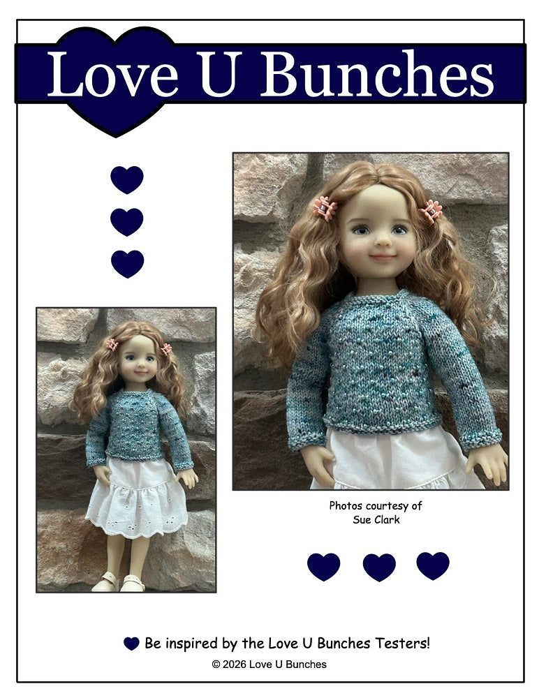 This PDF knitting pattern by Love U Bunches is designed to fit 13" dolls such as Little Darling.