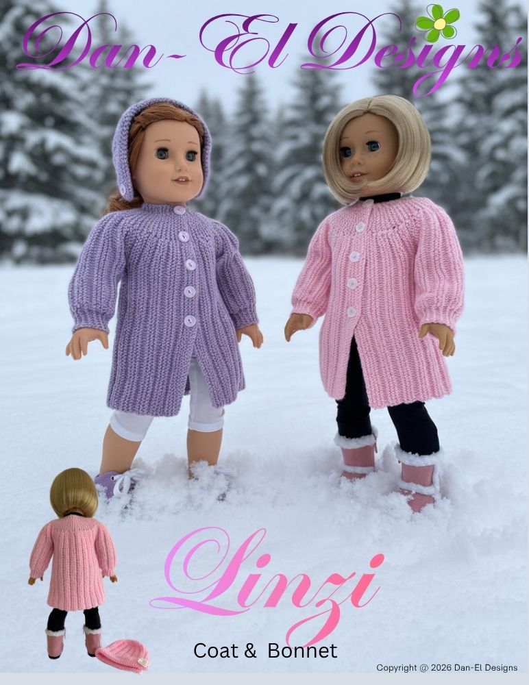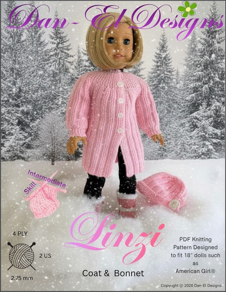 This PDF knitting pattern by Dan-El Designs is designed to fit popular 18” soft-bodied dolls such as those shown in the photos.