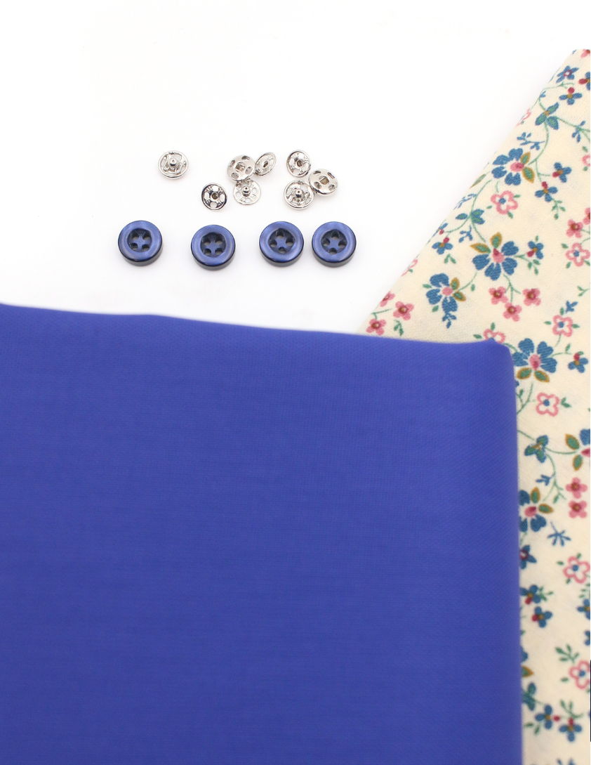Fabric: The fabric was hand-selected for it's doll sized scale and weight. It can used to create the specified items or a variety of other pieces! The blue fabric featured in this kit and on the covers of both patterns has a smooth crisp finish, perfect for a jacket. We've paired it with a vintage woven cotton fabric for the jacket lining.